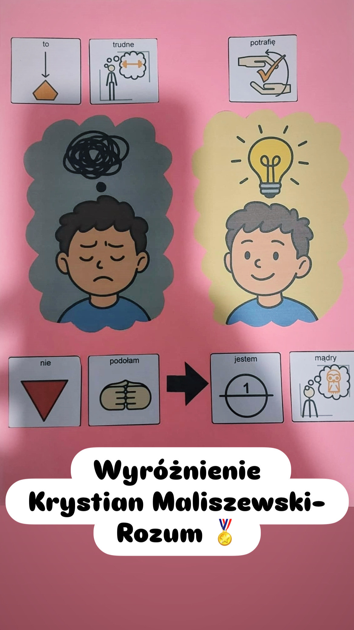 Zdjęcie 8: praca Krystiana Maliszewskiego-Rozum – kolaż wykorzystujący komunikację alternatywną pokazujący przemianę samokrytycznych myśli w pozytywne i wspierające